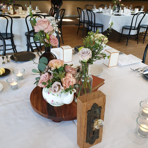 As with the rest of the floral decorations, the theme of the flowers for the centrepieces are based on the arrangements either worn or held by the wedded couple.